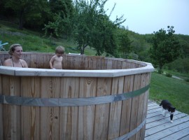 Per recuperare le forze, dopo la camminata nel bosco, ci attende un bagno di acqua calda in una grande vasca in legno immersa nella natura. Davanti a noi solo prati e boschi, sopra di noi fa capolino la luna e le prime stelle, il silenzio è surreale!