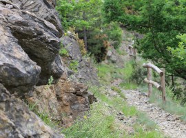 In seguito la vegetazione sarà più fitta e il terreno decisamente più roccioso, ma sempre di facile accesso, fino a giungere al Rio Masino, costeggiando alcune case. Sempre immersi in boschi di querce si continua a scendere, oltrepassando terreni per lo più abbandonati e anche una cava in disuso, giungendo a un ponticello che oltrepassa un affluente dell’Orba e che immette in una zona umida, questa volta ricca di faggi e felci rigogliose, che costeggiano il fiume.