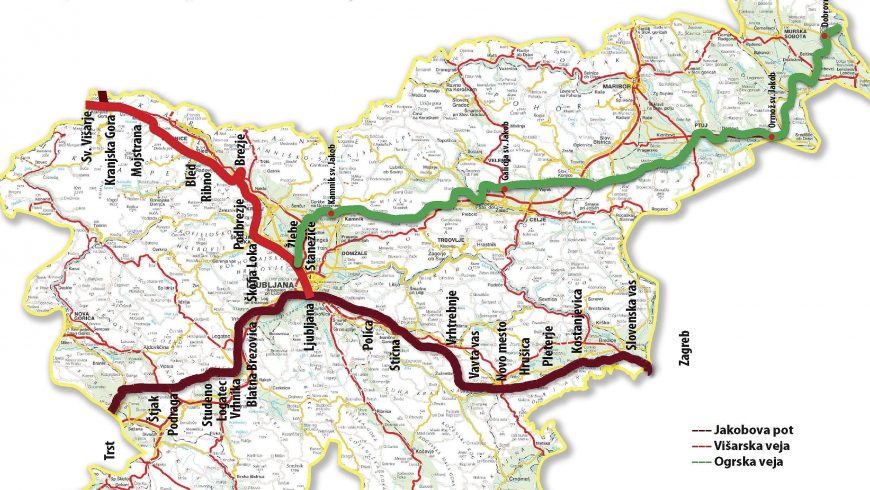 Il cammino Sloveno, che misura 403 km e percorre 20 tappe, è a forma di croce di Sant’Andrea. I due bracci si incrociano a Lubiana: una ramo va dal confine croato a quello austriaco, l’altro dal confine Ungherese a Trieste. Quest’ultimo verrà utilizzato per continuare il cammino da Budapest. Il percorso, che vede la sua partenza a Lenti (Slovenia), è per lo più collinare e misura un’altitudine massima di 851 metri. Ormoz, Ptuj, Kamnik, Lubiana,Predjama Castle sono alcuni dei borghi caratteristici attraversati dal tragitto.