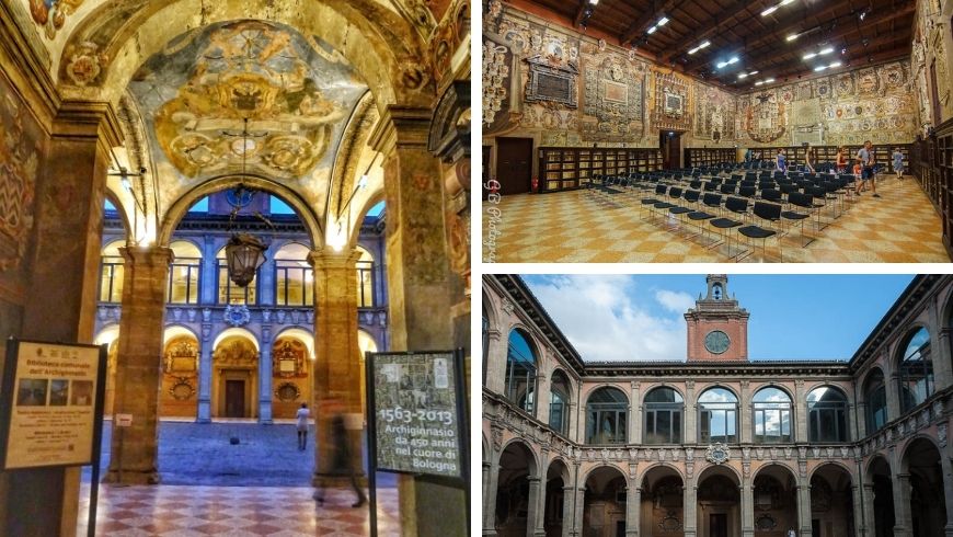Un’altra parte di storia è rappresentata dall’Archiginnasio, è uno dei Palazzi piú belli di Bologna. A primo impatto si vede solo il portone, ma entrandoci dentro troveremo il lungo portico con 30 arcate decorate da centinaia di stemmi e due logge ai piani superiori. L’obiettivo era dare una bellissima sede all’università più antica d’Italia. Si potranno vedere le decoratissime due aule magne, dove un tempo ospitavano artisti e legisiti. Inoltre vi è anche il Teatro Anatomico, distrutto dai bombardamenti del 1954, ma ricostrutito con i materiali originali.
